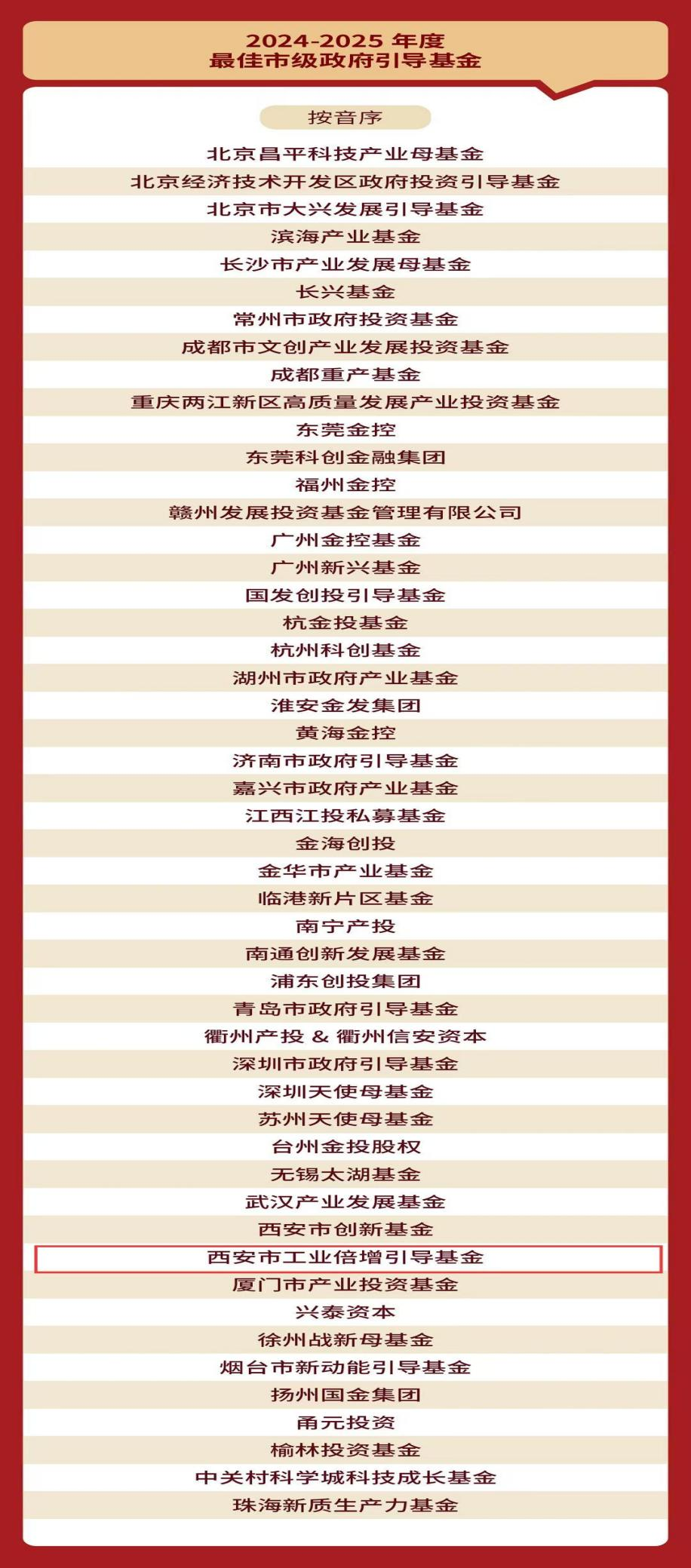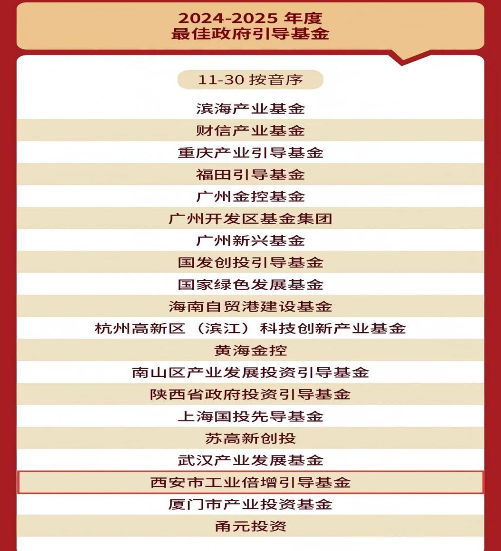2025年7月23日,融中發(fā)布2024-2025年度有限合伙人榜單。由西安投資控股負(fù)責(zé)市場化運作的西安市工業(yè)倍增引導(dǎo)基金榮獲“2024-2025年度最佳政府引導(dǎo)基金”“2024-2025年度最佳市級政府引導(dǎo)基金”。這是繼獲得清科“2025年中國政府引導(dǎo)基金50”“2025年中國地市級政府引導(dǎo)基金30強(qiáng)”榜單后,西安市工業(yè)倍增引導(dǎo)基金今年斬獲的又一行業(yè)權(quán)威榮譽。